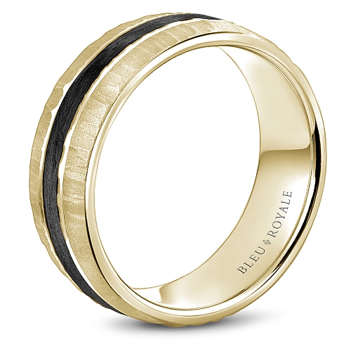 A Bleu Royale textured yellow gold wedding band with a black carbon center.